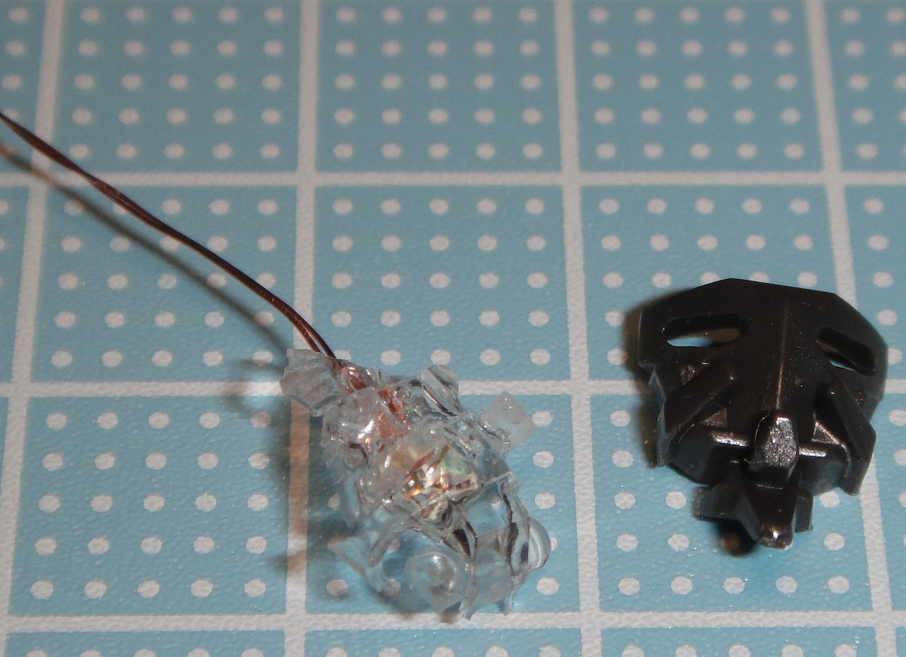 目のパーツは透明レジンで複製。固める時に明るいグリーンのチップLEDを入れてます。線材は0.2mmのポリウレタン線。縦1.6mm横3.2mmという極小サイズです。拡散タイプではなく直進性が高いLEDを選んでますので、目を正面から見ると眩しいです。