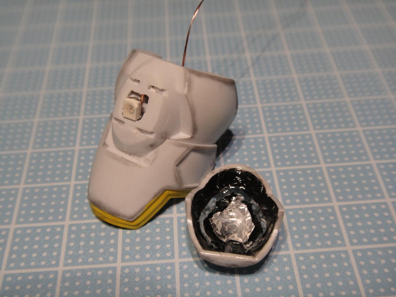 肩はやすりで削ってLEDを入れ、光を拡散するスペースを作ってます。肩のマークに沿って、ルーターで削り、裏に透明プラバンを貼り、表面から透明レジンを流しこみ硬化させてます。硬化後に透明プラバンを取り、光透過防止にグロスブラックで塗装し、アルミホイルを反射用に貼ってます。