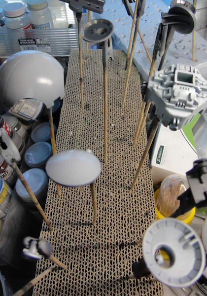 サフを吹いたところ。今回は通常のグレーと自家調合のダークグレーの2種類のサフを使用してます。